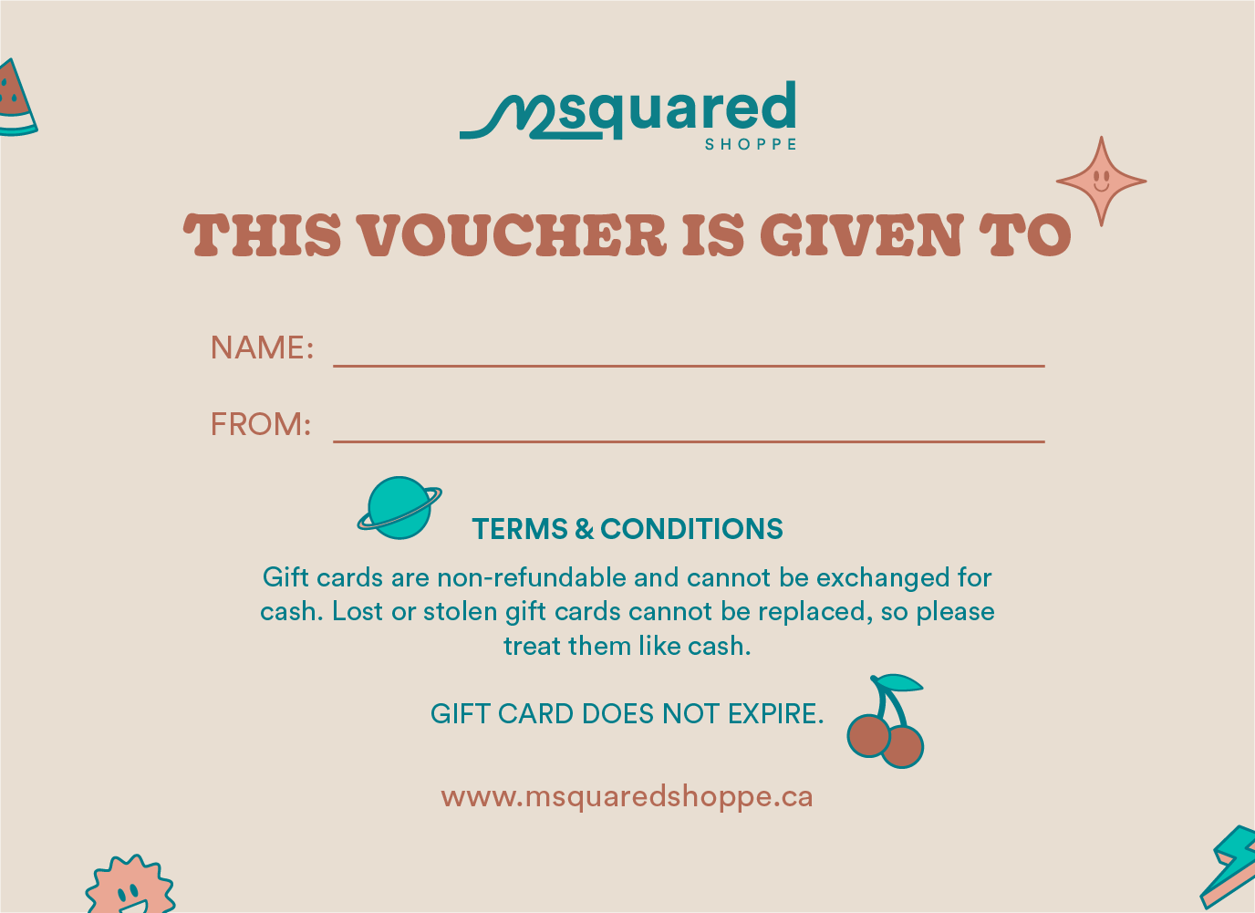 Gift vouchers can only be redeemed on www.msquaredshoppe.ca.